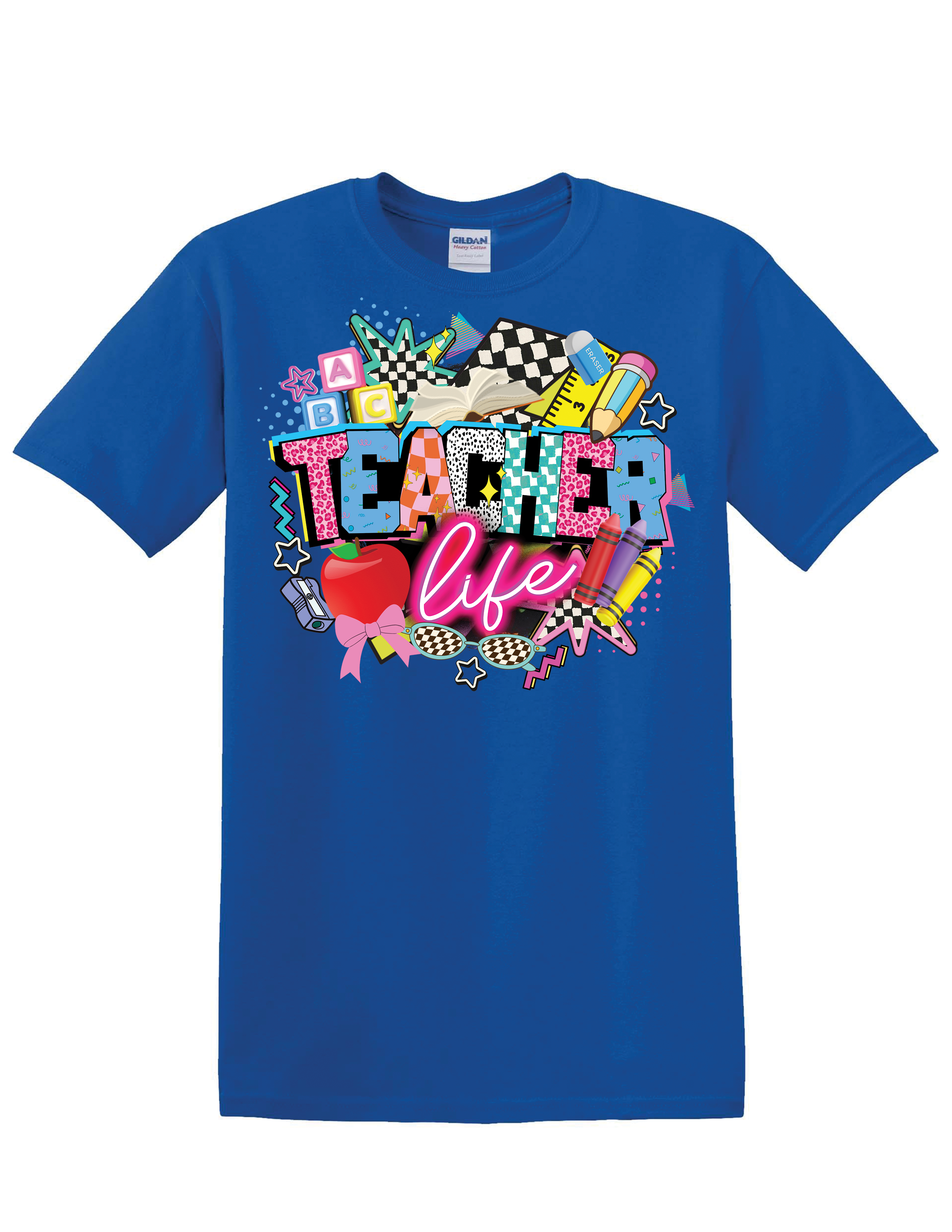 Brighten up the classroom and your wardrobe with our "Teacher Life" T-shirt — a colorful and creative tribute to educators everywhere! The design features the word "Teacher" surrounded by playful school elements like ABC blocks, a book, ruler, and eraser along the top. Underneath, the word "life" glows in a stunning neon pink cursive, shining just like a classic neon sign.