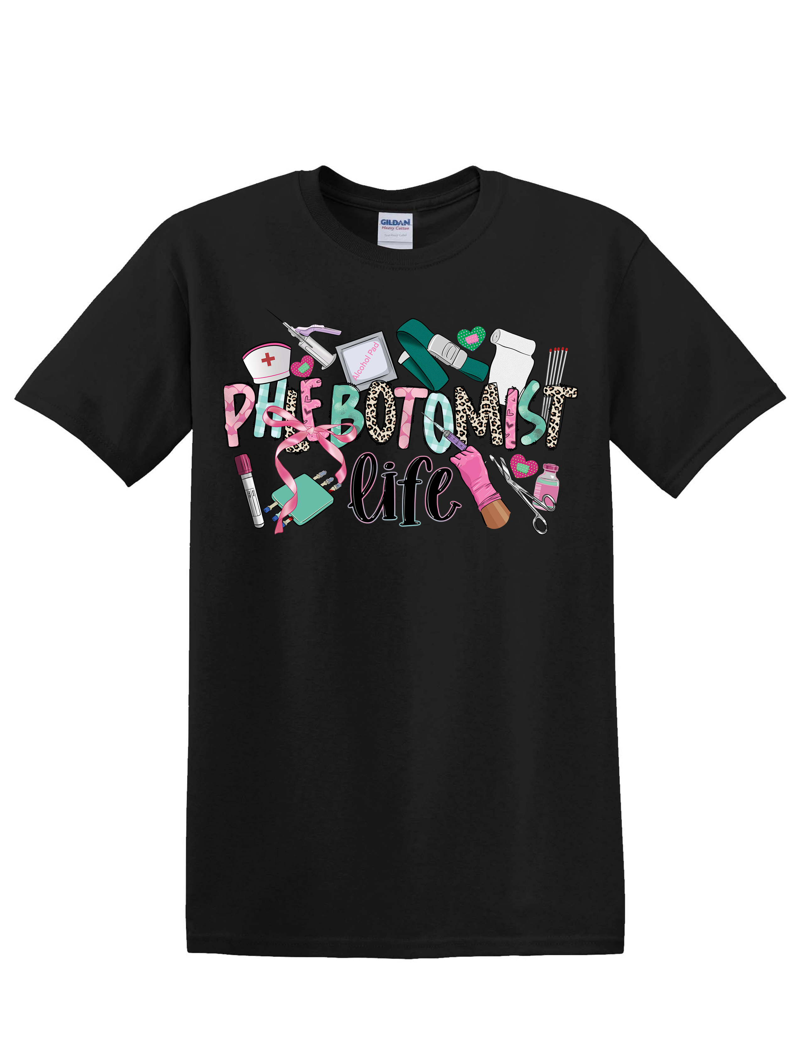 Show off your passion for the poke with our stylish Phlebotomist Life T-shirt — a perfect blend of skill, pride, and personality! This design features the words "Phlebotomist Life" surrounded by fun, career-inspired elements like syringes, blood vials, test tubes, gloves, heartbeat lines, and medical symbols — celebrating the important role phlebotomists play every day.